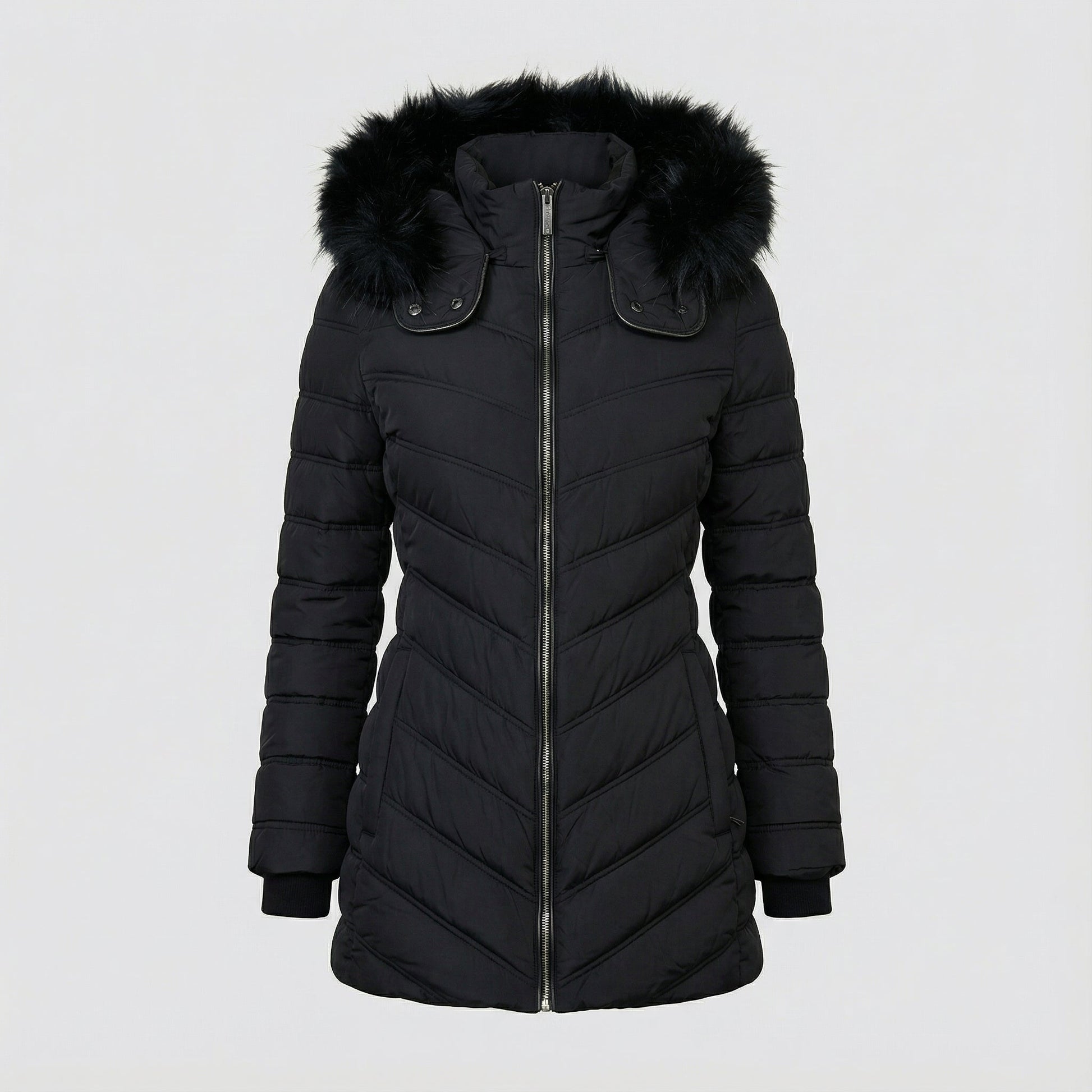 Esta chaqueta acolchada negra ofrece estilo y protección en invierno con una silueta entallada y un diseño moderno y versátil. La capucha con borde de pelo sintético y el cuello alto aportan calidez y un toque elegante. Fabricada con materiales térmicos y detalles de acabado cuidado, es perfecta tanto para el uso diario como para ocasiones especiales en climas fríos.