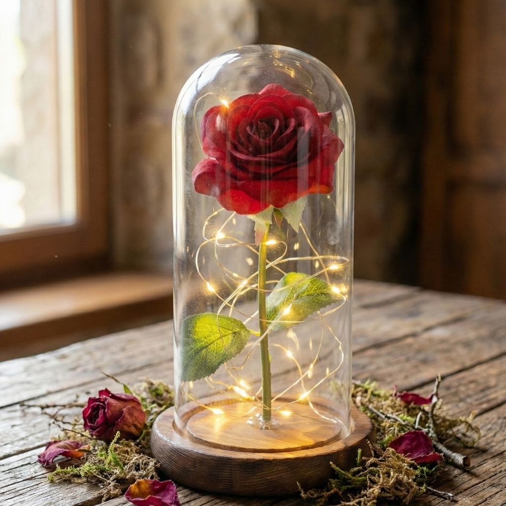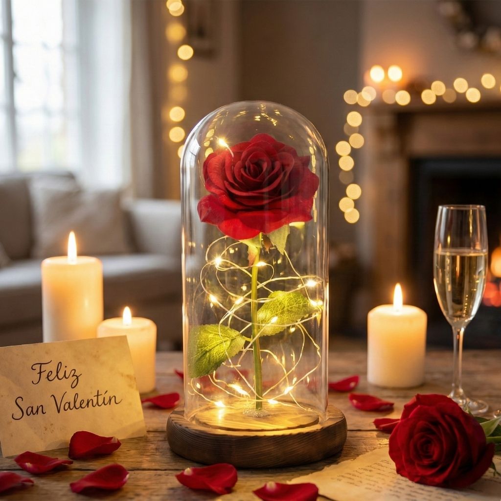 Mientras que el tiempo marchita los pétalos de cualquier jardín, nuestra Rosa de Cristal preserva su esplendor bajo una cúpula de protección. Iluminada por una luz cálida, no es solo un adorno, es el recordatorio de los momentos más brillantes de vuestra relación.